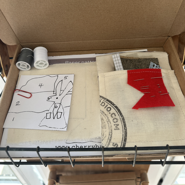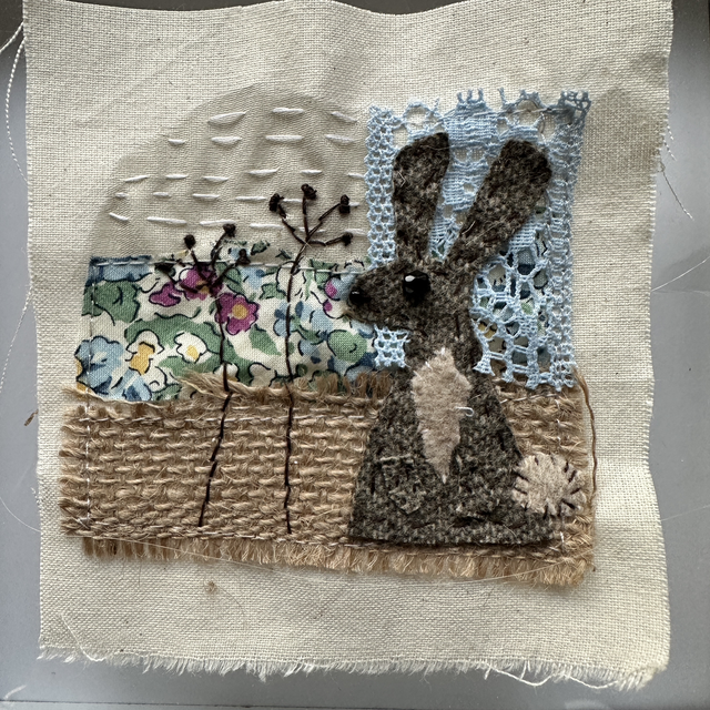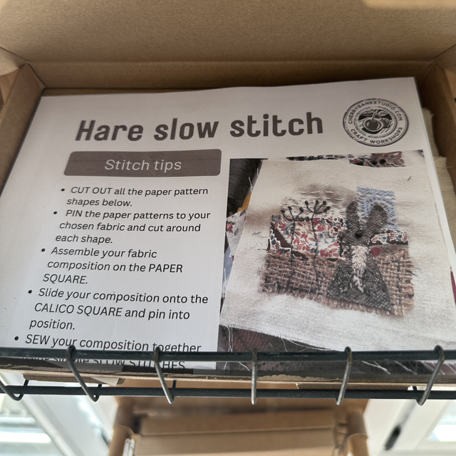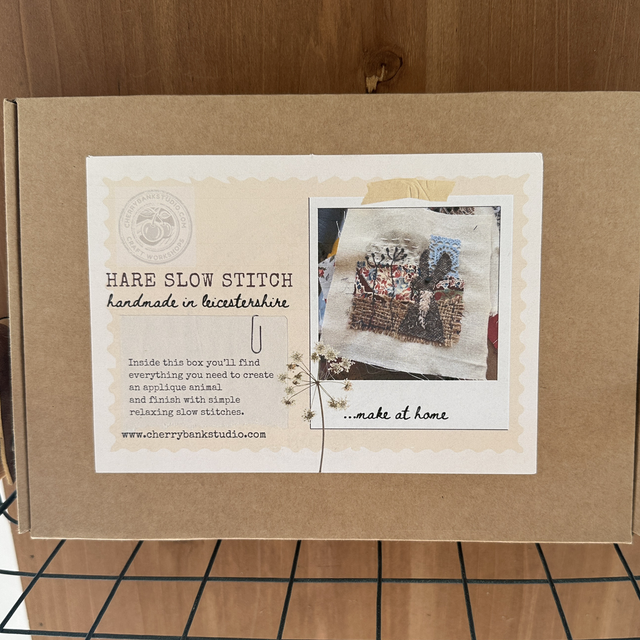 In your MAKE AT HOME box you’ll find everything you need to create a slow stitch cute hare appliqué. Your prepared pocket of fabrics, needles & pins allows you to push your creativity. You’ll find helpful sheets with templates and slow stitch top tips but ultimately this is your very own piece of textiles art.