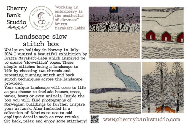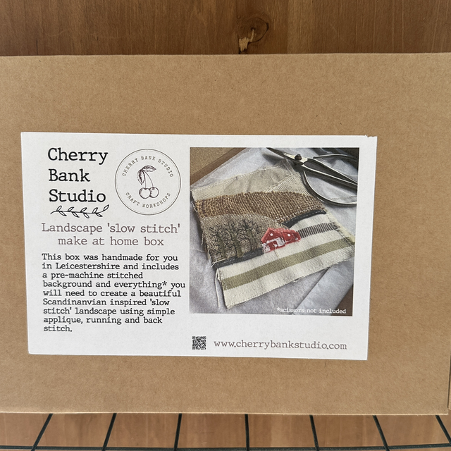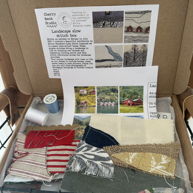 In your MAKE AT HOME box you’ll find everything you need to create a slow stitch Scandinavian inspired landscape. Your prepared appliquéd base is ready for you to add houses, trees, boats, fauna etc of your own inspiration. You’ll find helpful sheets to advise you on house shapes and stitch techniques.