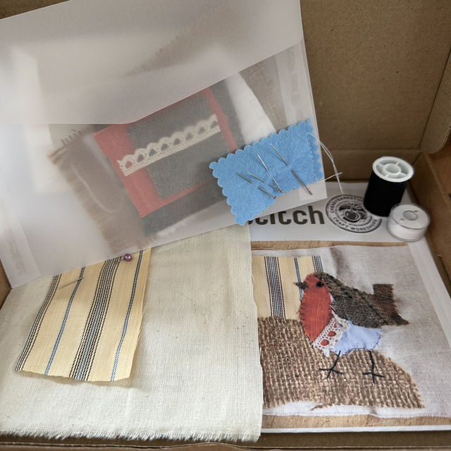 In your MAKE AT HOME box you’ll find everything you need to create a slow stitch cute robin appliqué. Your prepared pocket of fabrics, needles & pins allows you to push your creativity. You’ll find helpful sheets with templates and slow stitch top tips but ultimately this is your very own piece of textiles art.