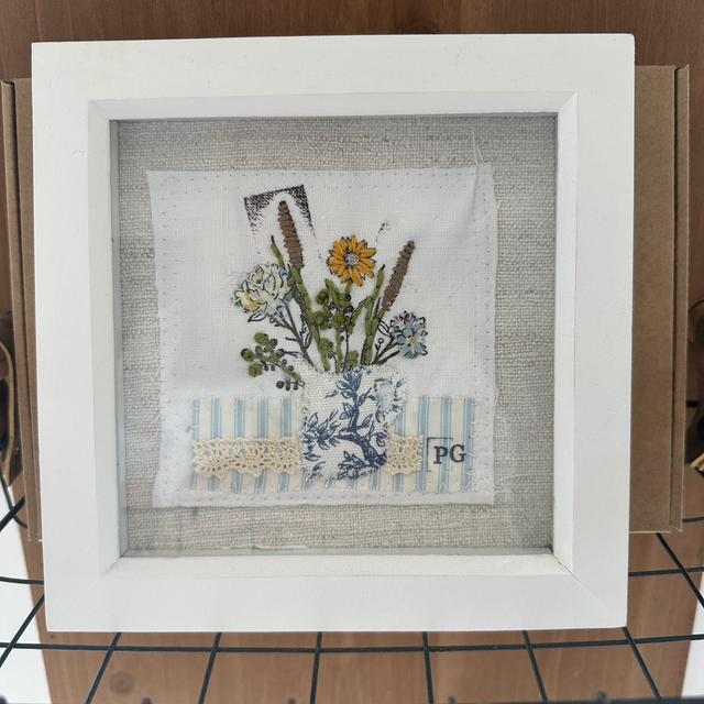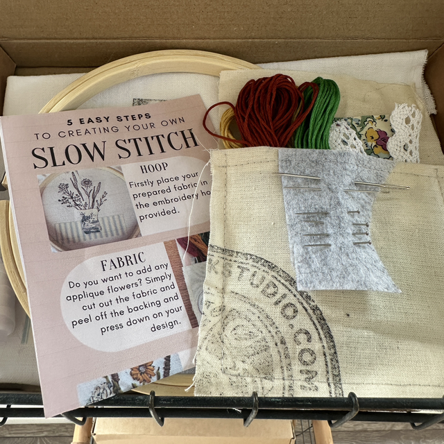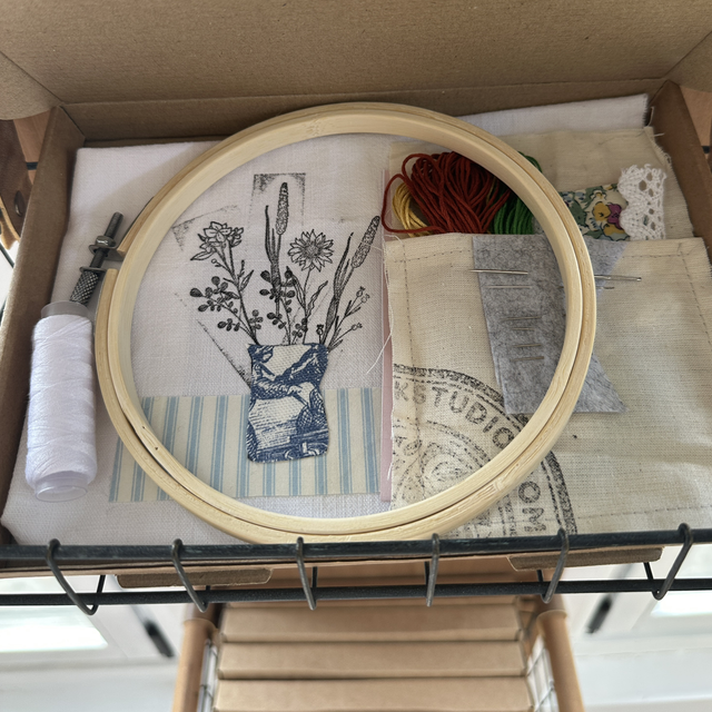 In your MAKE AT HOME box you’ll find everything you need to create a slow stitch vase of flowers appliqué. Your prepared pocket of fabrics, threads and needles allows you to push your creativity. You’ll find helpful instructions but ultimately this is your very own piece of textiles art.